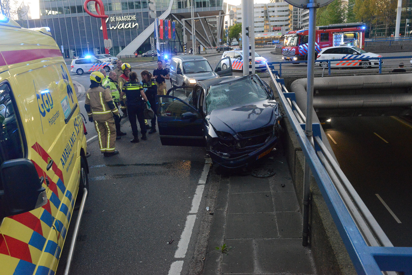 Hierna is de auto onder andere tegen het hekwerk van een viaduct gebotst.
